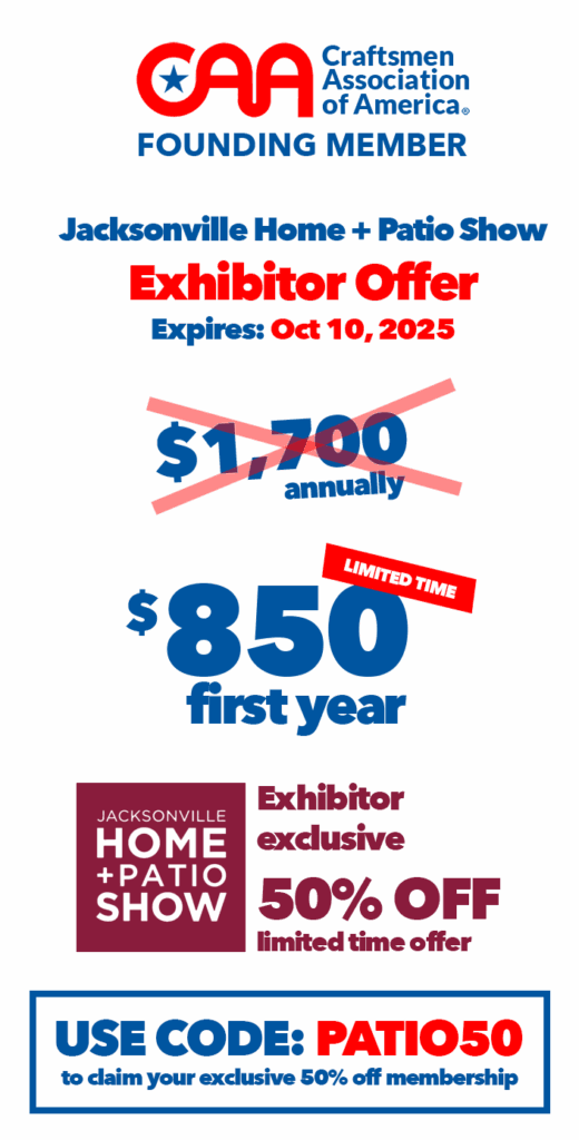 Exclusively for Jacksonville Home & Patio Show exhibitors: Use coupon code PATIO50 at checkout to receive 50% off your first year of membership with the Craftsmen Association of America.